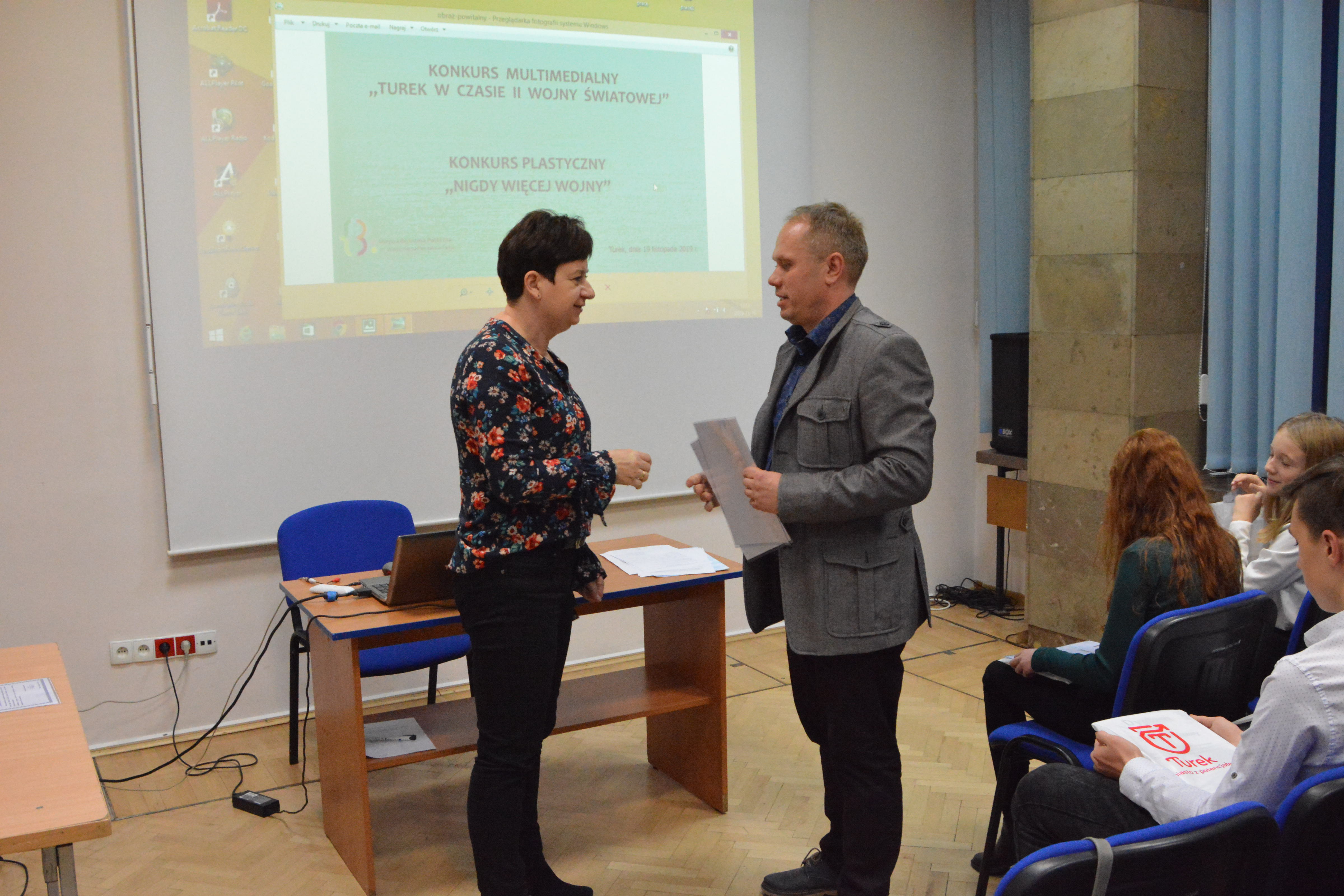 We wtorkowe popołudnie w siedzibie Miejskiej Biblioteki Publicznej w Turku odbyło się rozstrzygnięcie dwóch konkursów połączone ze spotkaniem dla uczestników Programu 50+. Pierwszy z nich dotyczył wykonania prezentacji multimedialnej pod hasłem: „Turek w czasie II wojny światowej”, a drugi konkurs – wykonania pracy plastycznej w formie plakatu pod hasłem „Nigdy więcej wojny”. Komisja Konkursowa w składzie: Bartosz Stachowiak – Dyrektor Muzeum Miasta Turku, Małgorzata Pawłowska – pracownik Czytelni Książek, Czasopism i Zbiorów Regionalnych oraz Marcin Michalak – pracownik Pracowni Komputerowej i Wypożyczalni Zbiorów Multimedialnych, postanowiło przyznać 3 nagrody. Pierwsze miejsce zajęła prezentacja multimedialna Mikołaja Kacprzaka i Szymona Kurzawy, uczniów kl. VIII d Szkoły Podstawowej nr 1 w Turku, drugie miejsce zajęły uczennice kl. VI d Szkoły Podstawowej nr 1 – Lena Gradzik i Gabriela Macudzińska. Natomiast miejsce trzecie przypadło Martynie Kazikowskiej, uczennicy kl. VI d Szkoły Podstawowej nr 5 w Turku.